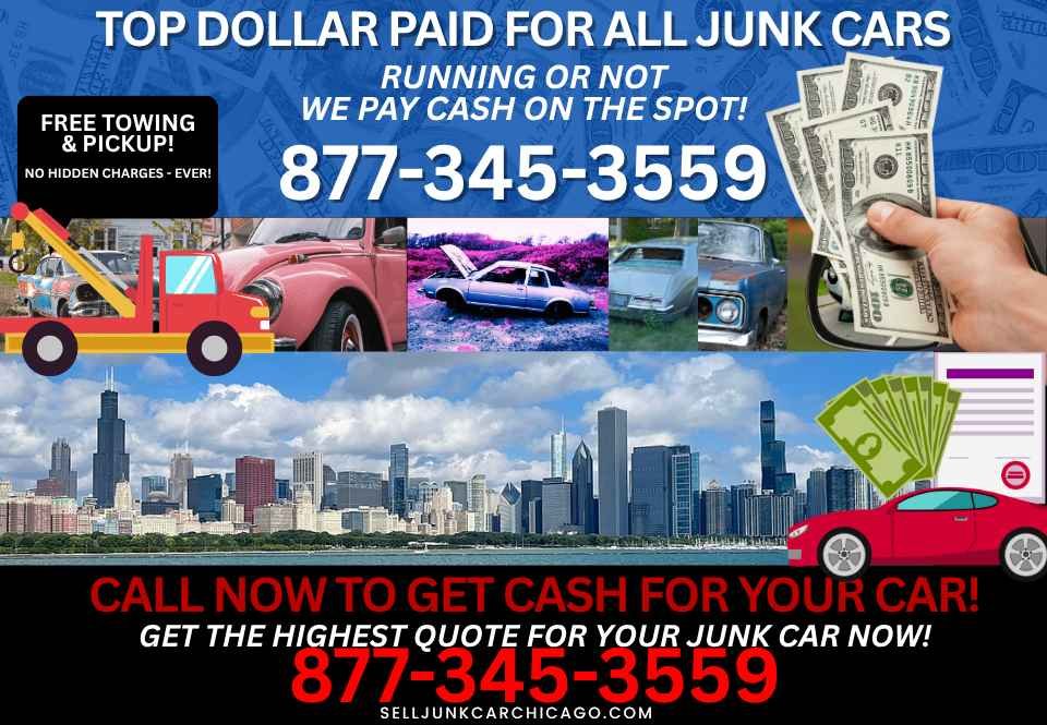 Junk Car Chicago's business is simple: We buy used cars, we buy junk cars, we pay top dollar on the spot and we tow them away for free.